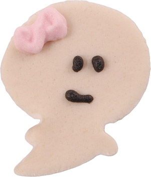 Handmade fondant toppers in the shape of little white ghosts with a pink bow