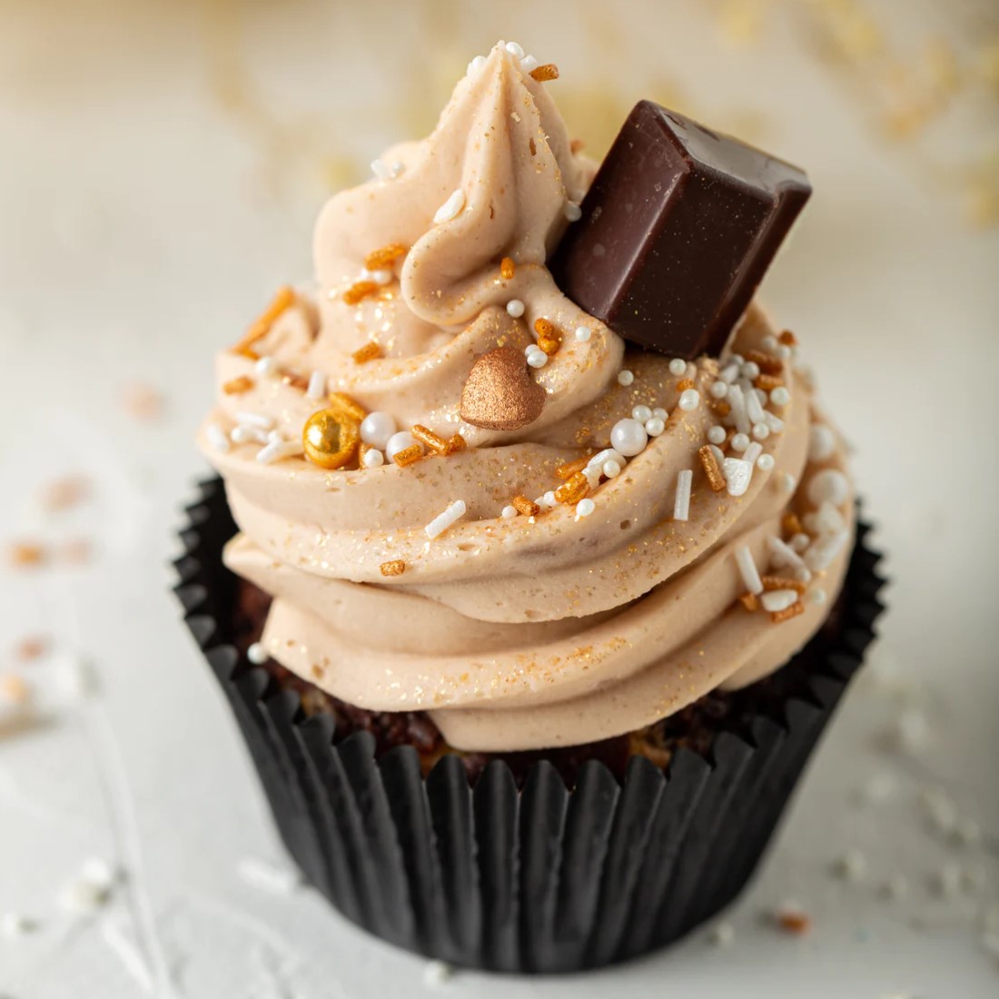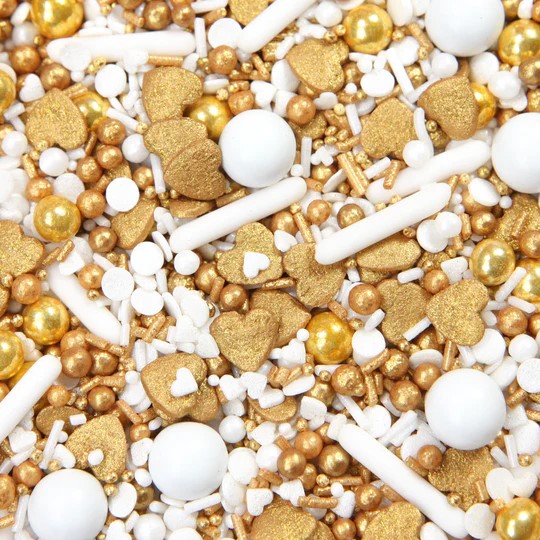 Colorful mixed sprinkle decor "MitJeföhl". Sugar mixture of large white chocolate balls, medium and small golden sugar pearls, large golden hearts, small white hearts, white sticks, white flakes and sprinkles
